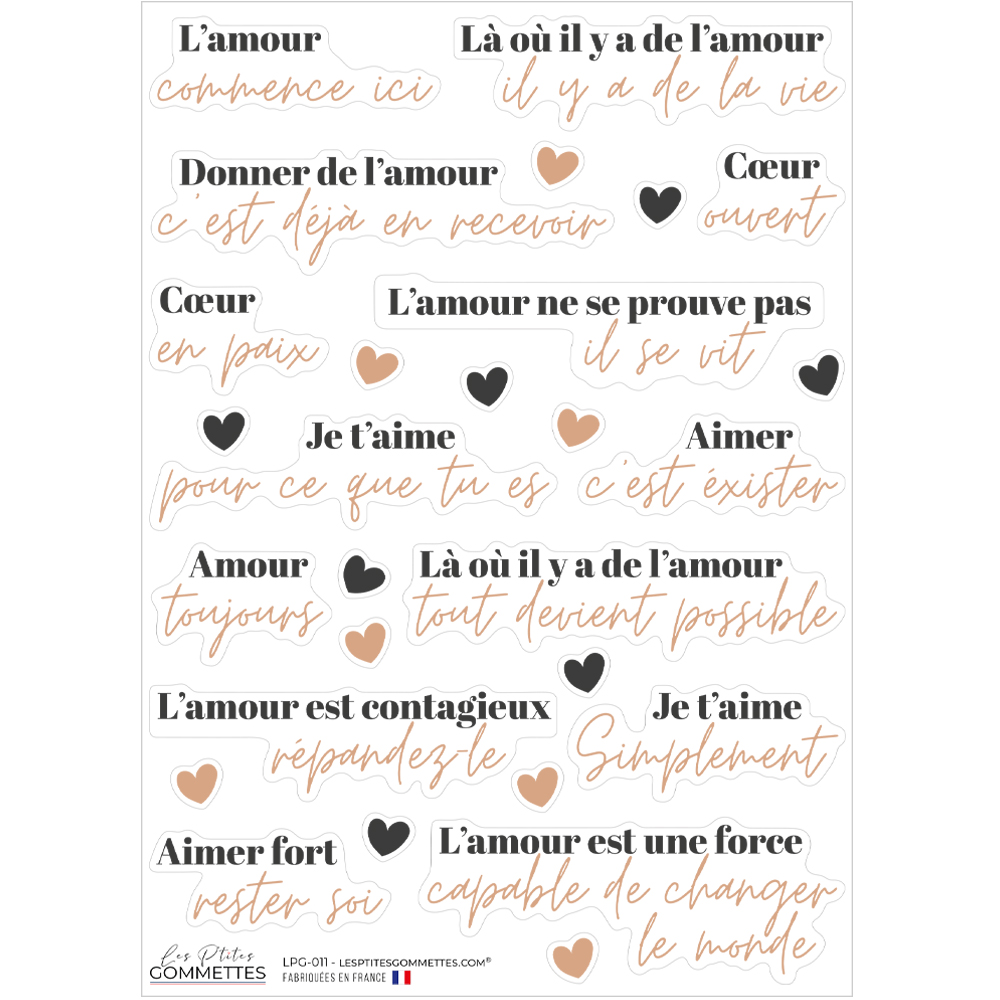 Cette planche de stickers célèbre l’amour sous toutes ses formes : amour de soi, amour des autres, amour du quotidien. Chaque citation invite à la douceur, à l’ouverture du cœur et à la bienveillance.